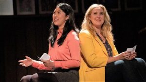 The structure of the show has its problems too. The constant breaking of character becomes disturbing when it happens too often, and the sequencing is choppy and uneven. The presentation is in four distinct sections: 1) the 15-year-old Heidi versus her 45-year-old self, 2) the character of the American Legion debate judge who becomes a nonbinary character; the point being that they would have likewise been excluded from Constitutional protections, 3) the debate between Heidi and a real teenager about the need to write a brand new Constitution, and 4) the last scene when Heidi and the 15-year-old teen break character and sit back to back, asking each other questions about their lives. This last part is anticlimactic and basically fills up time.