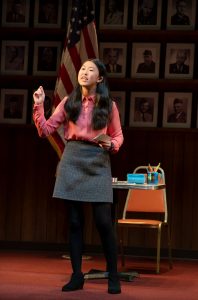 In a unique twist, we witness our talented debater take on a challenge from a current high school student (in this case, the very talented debater and future actress Jocelyn Shek, who comes from LA); I wonder why the producers did not cast a local high school student to take on the debate challenge here; I’d love to see a local student shine on our stage as he or she takes on the most global question of all: should our U.S. Constitution be abolished? If that question sounds out of bounds for you it’s because you have not yet seen the show. Sit thru the first 80 minutes of this play, and you too will feel the need to consider and debate this grandest of all national questions.