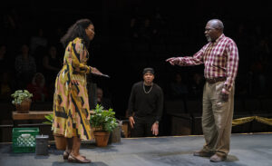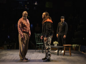 Our location is the home of Henry “Mr. Mano” Tamano ( played to perfection by Michael Potts). We meet him along with the “ghost” of his son, Marcus ( deftly handled by Glenn Davis), who he sees and talks to throughout the play. Under the special direction of Awoye Timpo, who understand the use of an arena stage and makes sure that no section of the audience gets stuck seeing actors backs for any long periods, we get to understand that it seems another son Eli ( Esco Jouley), is dead and the city is ready to settle with Mr. Tamano. While Marcus tells his dad to “take the money”, he is not happy with this being the only alternative.