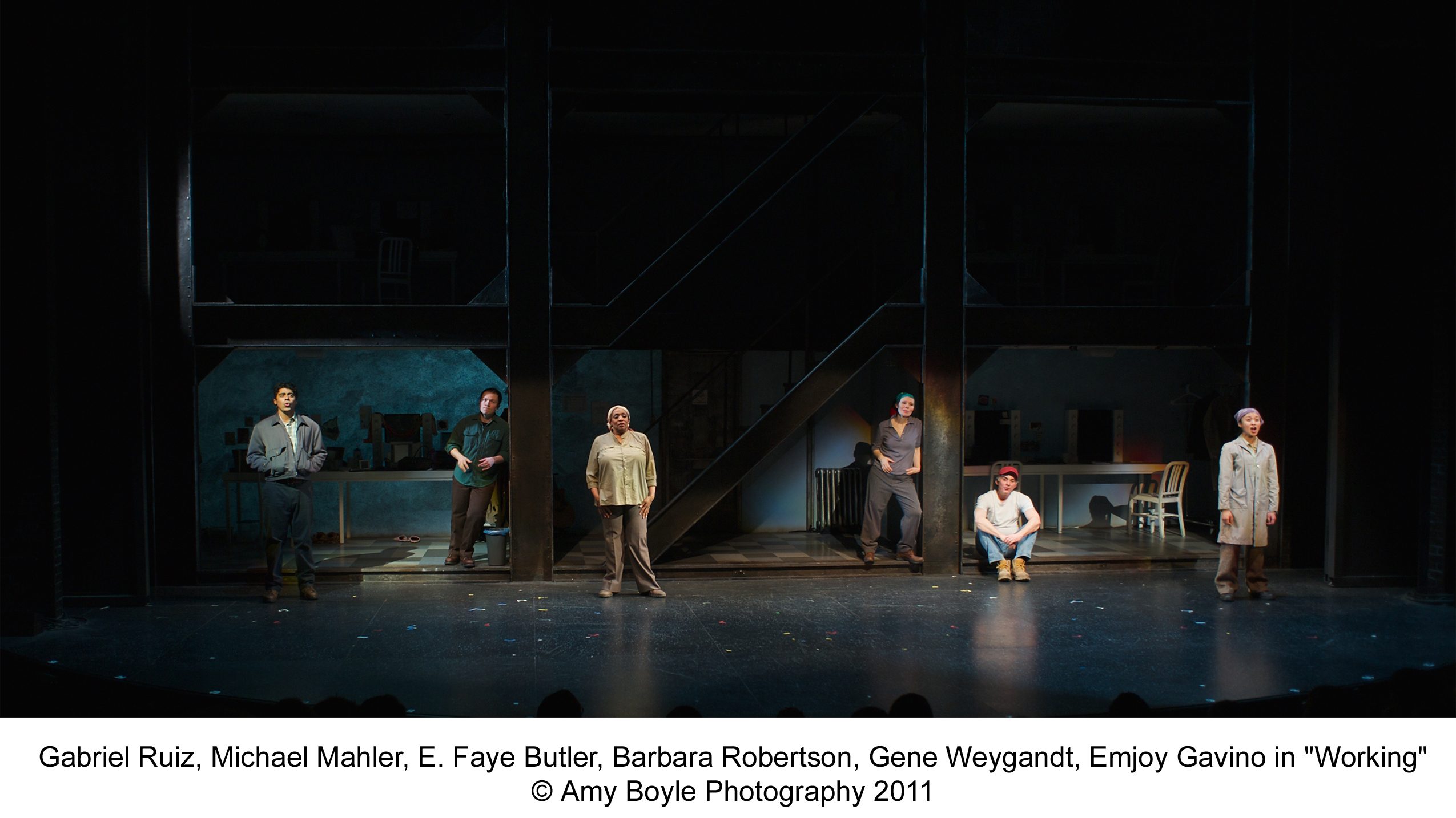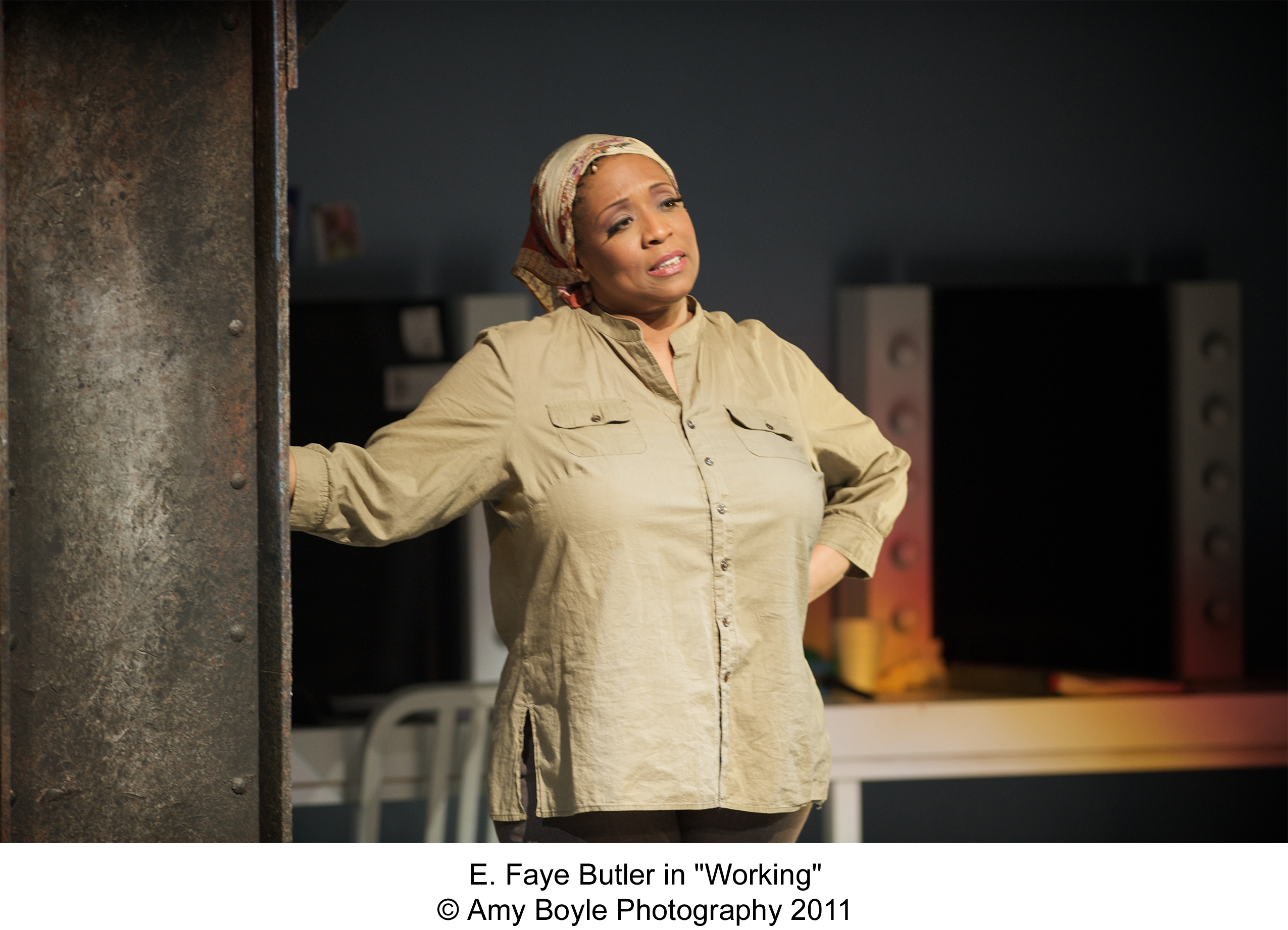 The cast is made up of young and old performers, some of whom are Chicago legends already with the great work they have done over the years, a few, newer but getting better known and two almost brand new to the scene, but names that will be around for a long time. Let me start at the very beginning; young Emjoy Gavino who proves that big things come in small packages with her big voice and her marvelous rendition of James Taylor’s “Millwork”. Gabriel Ruiz ( a young member of Teatro Vista) gets a chance to show his ability to handle variety as he plays an old stone mason, a young high school drop out working deliveries and a young “hippie-type” that wants some control in his life). Michael Mahler, a musician who also writes music has been seen on many Chicago area stages and is a pleasure to watch on stage. he is one of those actors with great facial expressions and when he does the UPS “delivery” speech ( it used to be the meter reader) one cannot keep from laughter.He also does a brilliant version of the fire fighter as well as his ” Brother Trucker”- he just keeps getting better! Talk about better- E.Faye Butler is astounding in her characters from her “Just A Housewife” to her prostitute to her show stopping Maggie and her “Cleanin’ women” number. Barbara Robertson, one of Chicago’s finest also stops the show with her “Its’ An Art” number about the skill of being a waitress ( her doing the split is hysterical) but she also shines as Rose Hoffman, the school teacher who speaks about the changes in our country, our culture and our school system “Nobody tells Me How”. Filling out this fine cast is Gene Weygandt who begins the show with “The Livelong Day” asking if somebody will pay him a million dollars to tell the story of his life and work, cause if somebody would, he wouldn’t have to do it no more. Weygandt, who is known for his versatility on our stages also plays a hedge fund manager, Joe Zutty, a retiree ( “Joe”, is a song that will make you think about the aged and their lives) and then returns to his iron worker role to tell a story about “Fathers and Sons” that is sure to bring a tear to your eye. This leads into a finale that brings all these people together in the fact that we all need “Something To Point To”, something to be proud of and something to be remembered for. This is a powerful ending to a super 110 minutes of entertainment ( no intermission, and I am glad to say, it works better without one)